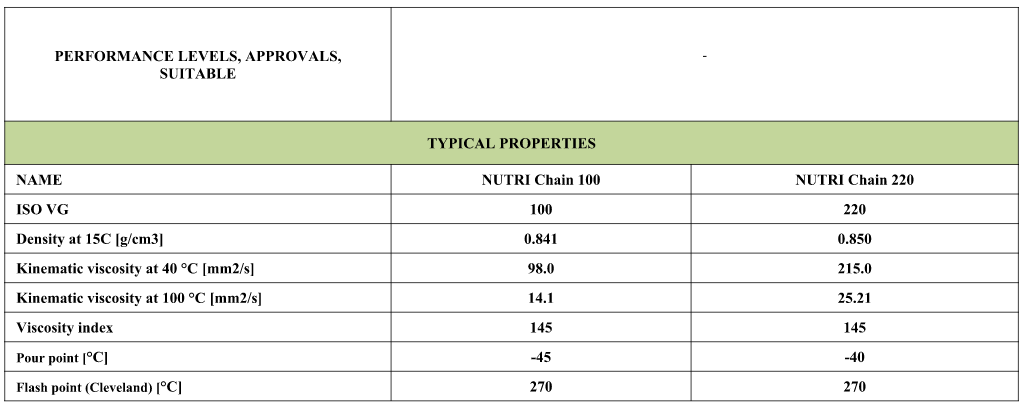TKP Lubricants Nutri Chain family ( ISO VG 100 and ISO VG 220) is a synthetic chain lubricating oil produced from PAO (Poly-alpha-olefines) base oil and carefully selected additives, that can be used specifically for the lubrication of chains used in the food processing industry. This product can be used as food-grade lubricant in the direct and indirect environment of food processing, where there is a possibility of incidental food contact.